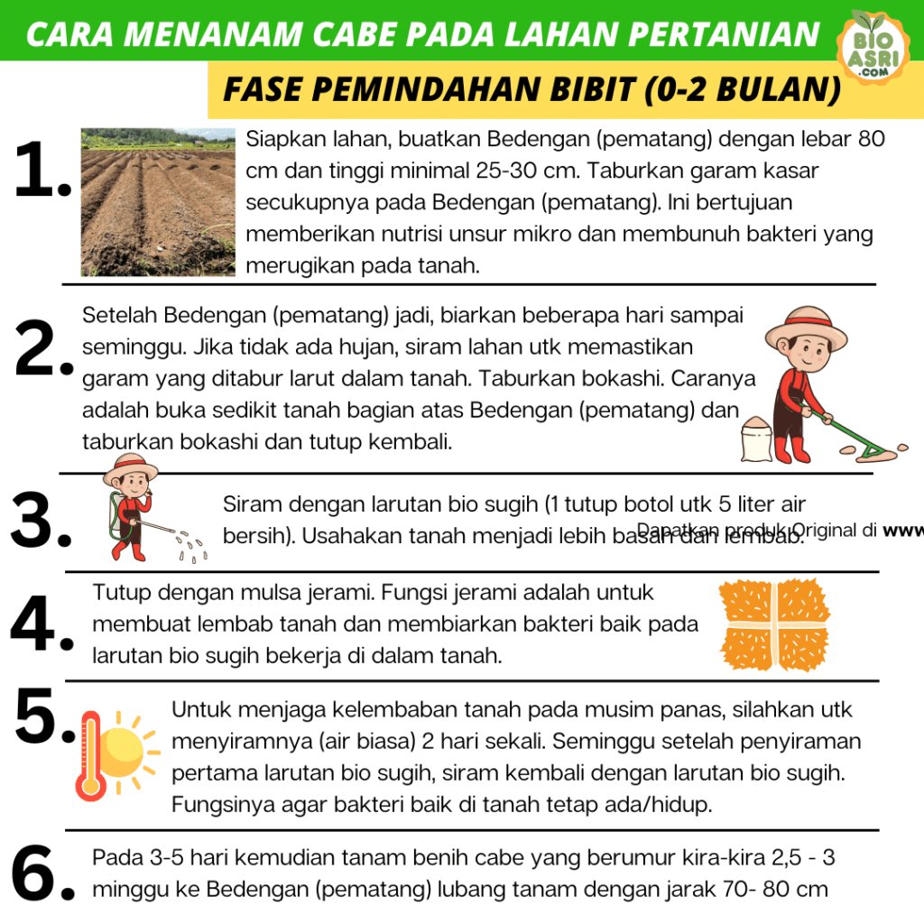 - Pada 3-5 hari kemudian tanam benih cabe yang berumur kira-kira 2,5 – 3 minggu ke Bedengan (pematang) lubang tanam dengan jarak 70- 80 cm