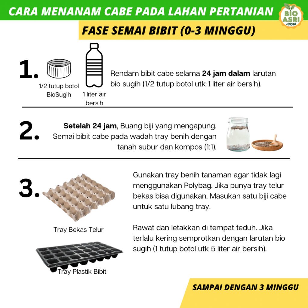 - Rendam bibit cabe selama 24 jam dalam larutan bio sugih (1/2 tutup botol utk 1 liter air bersih).