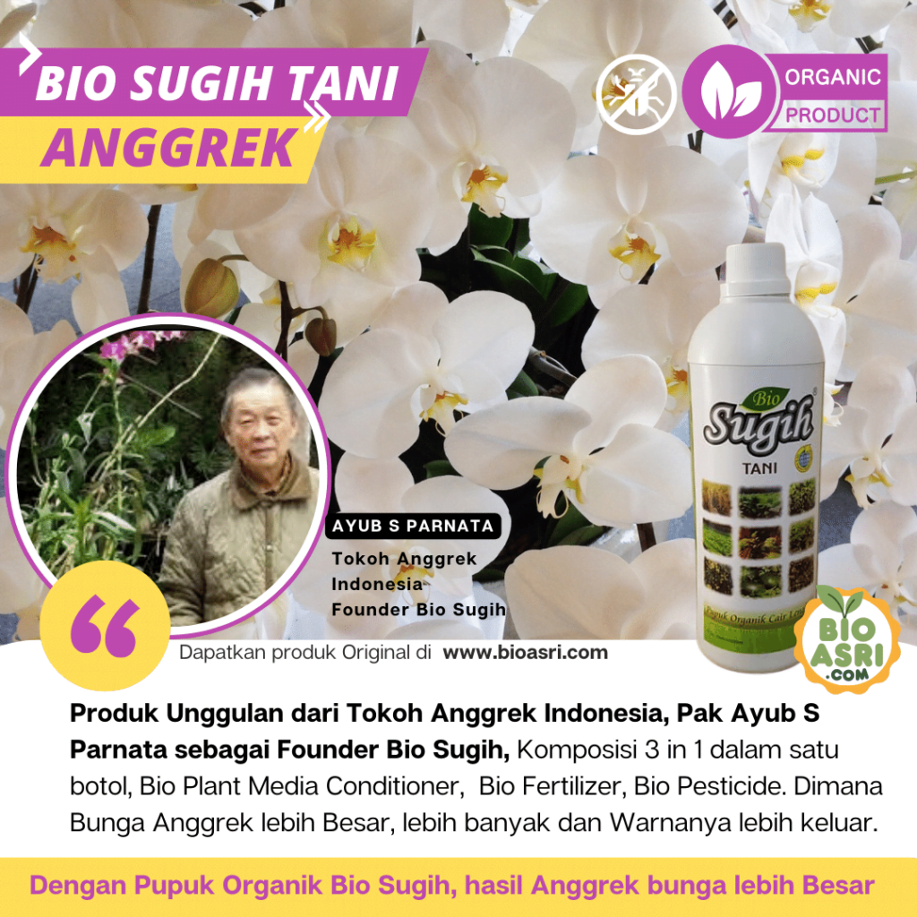 Produk Unggulan dari Pakar Anggrek Indonesia ini sekaligus penemu Pupuk Bio Sugih, Pak Ayub S Parnata. Pupuk Organik Cair Bio Sugih ini mempunyai komposisi 3 in 1 dalam satu botol, membuat Bunga Anggrek menjadi lebih besar dan warnanya lebih keluar.
