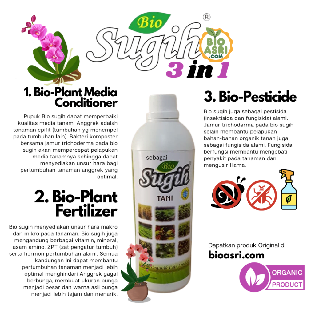 1. Bio Plant Media Conditioner Memperbaiki kualitas media tanam, kandungan Bakteri Komposter dan Jamur Trichoderma Bio Sugih membuat unsur hara bagi pertumbuhan tanaman anggrek yang optimal.