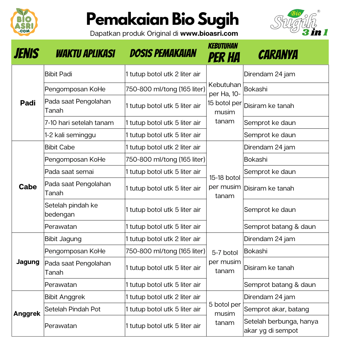 Berikut ini adalah tabel pemakaian Pupuk Organik Cair Bio Sugih 3 in 1, ke beberapa jenis tanaman, diantaranya Padi, Cabe, Jagung, Anggrek.