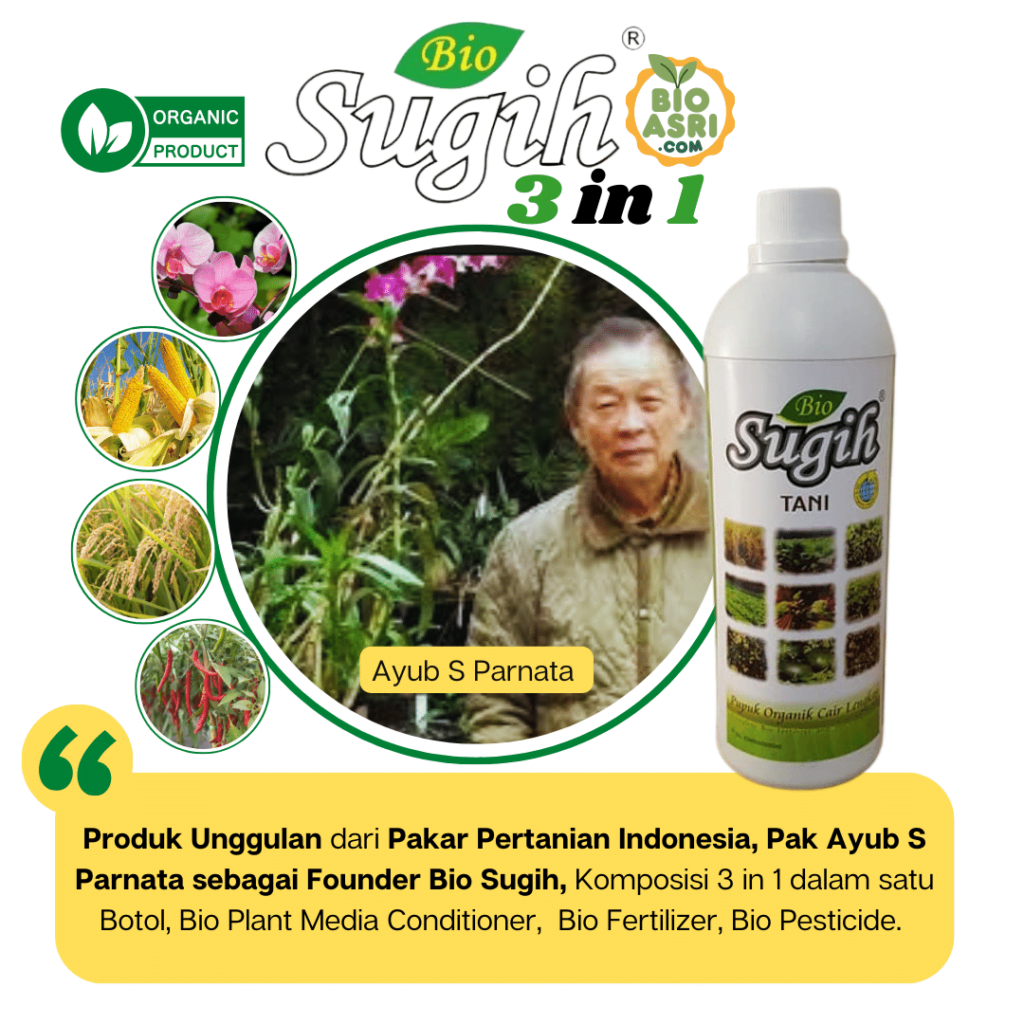Pupuk Organik Cair Bio Sugih adalah Pupuk 3 in 1 dimana di dalam satu botol nya sudah terkandung, Bio Soil, Bio Fertilizer dan Bio Pesticide. Pupuk Organik Lengkap karya seorang Pakar Pertanian Indonesia, Ayub S. Parnata. Beliau adalah Tokoh Penemu Bakteri Kompos Organik yang kemudian mengaplikasikan pada pupuk temuannya.