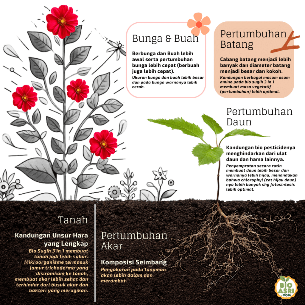 Kandungan Pupuk Bio Sugih sudah terdapat unsur-unsur untuk pertumbuhan akar, batang, daun, dan bunga dengan komposisi yang seimbang sehingga dapat membantu pertumbuhan yang optimal.